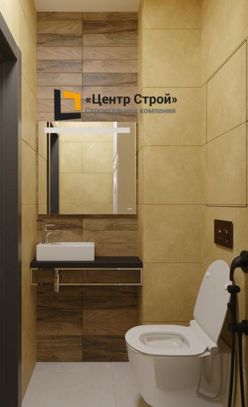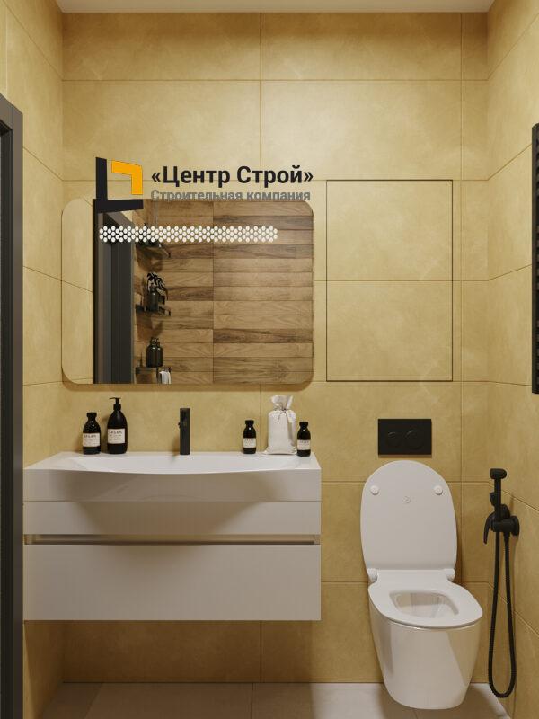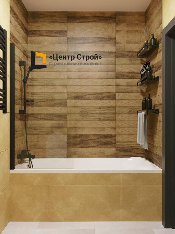 Стены и экрана ванны — керамогранит крупноформатный 400 х 800 мм, пол — керамогранит 600 х 600 мм, керамогранит 100 х 700 мм, натяжной потолок ПВХ — полотно BAUF, встраиваемые светильники.