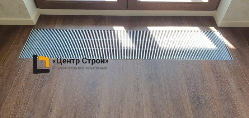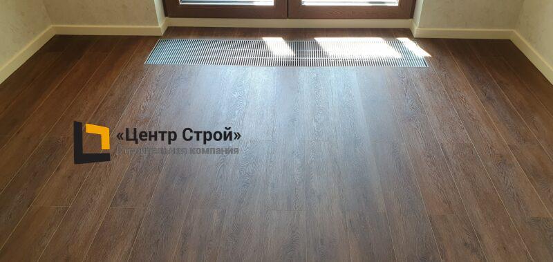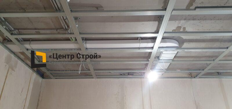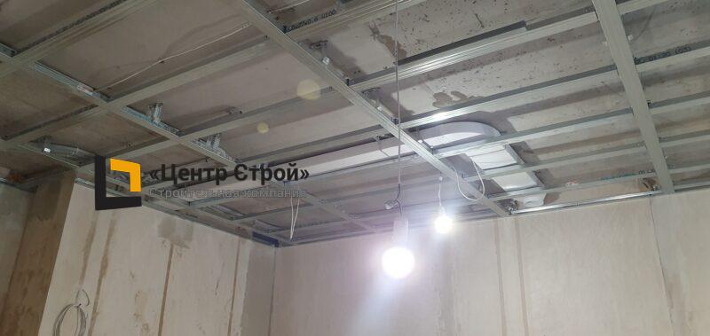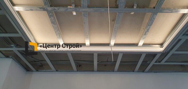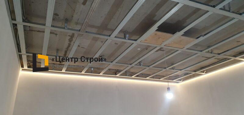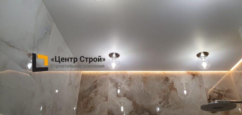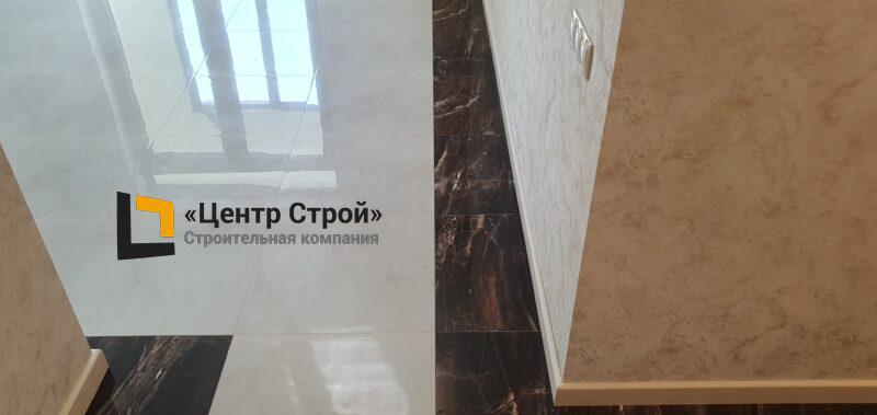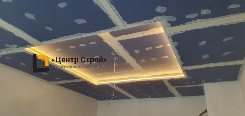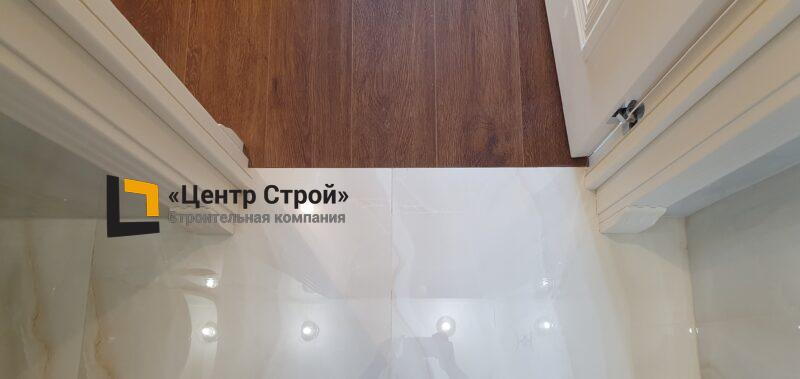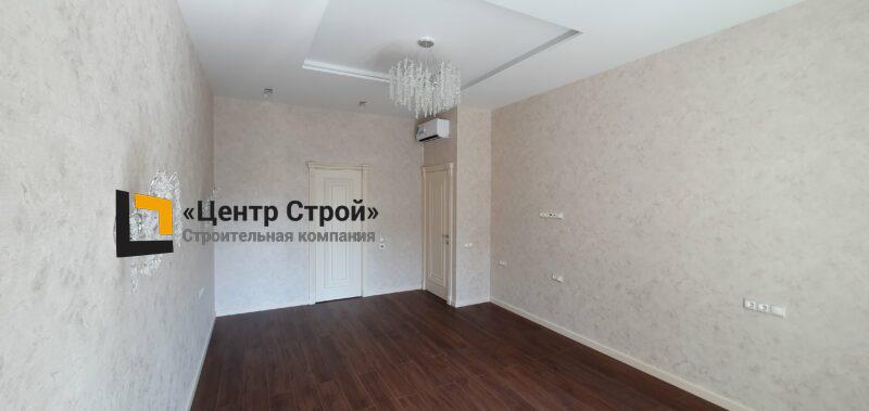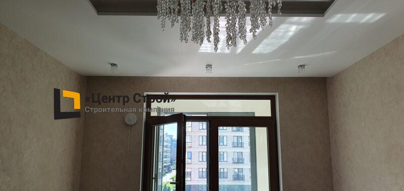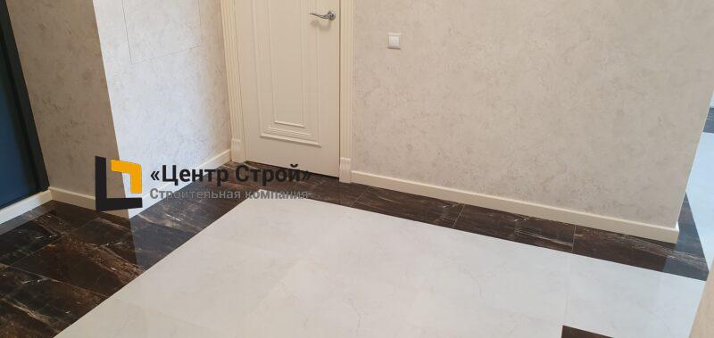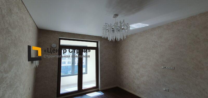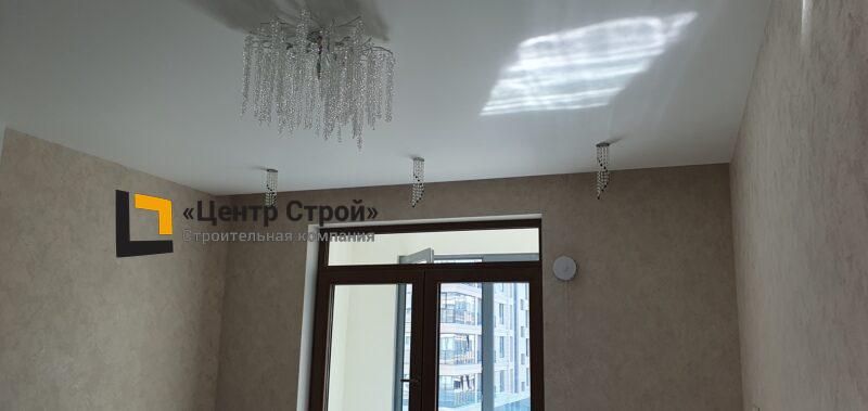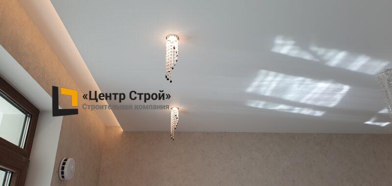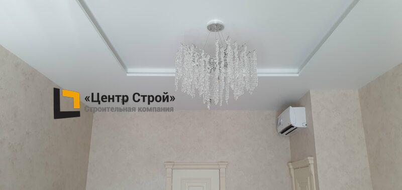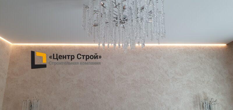 Стены — виниловые обои на флизелиновой основе, пол — керамогранит 600 х 600 мм, потолок — подвесной из гипсокартона KNAUF (одноуровневая комплектная система П 113) с нишевым профилем Fergipps, светодиодной подсветкой скрытой ниши для штор, встраиваемые светильники и люстра, плинтус напольный МДФ под покраску белый.