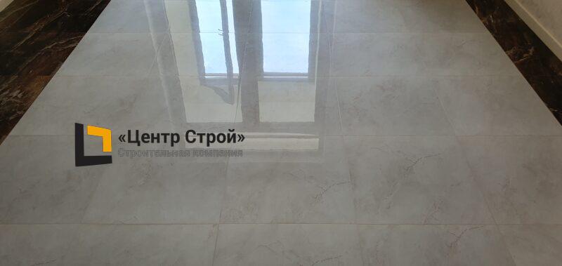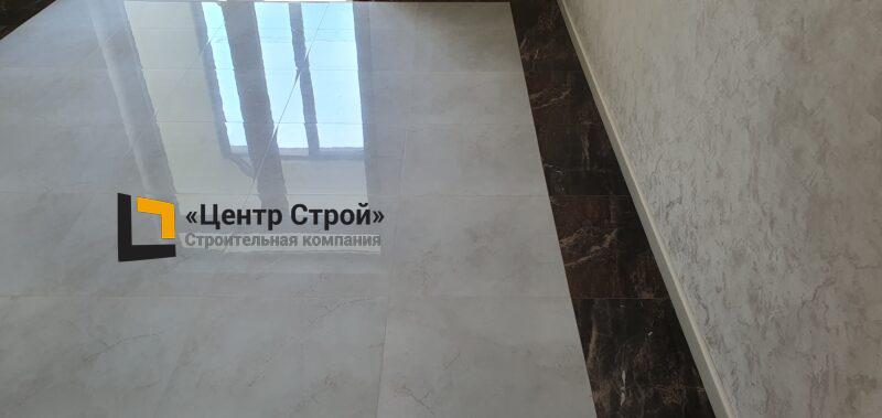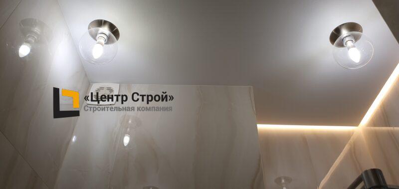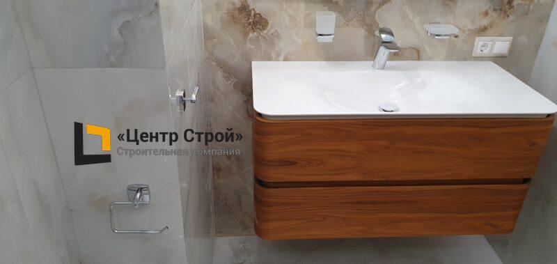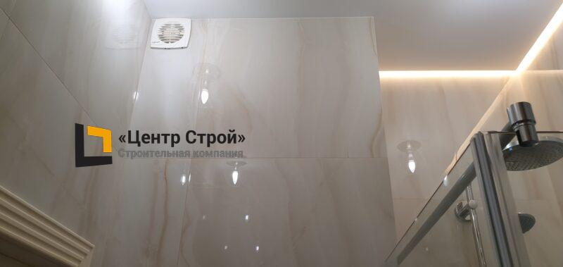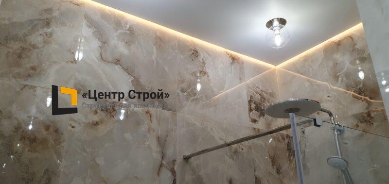 Стены — керамогранит 1 200 х 600 мм, пол — керамогранит 600 х 600 мм, потолок — подвесной из гипсокартона KNAUF (одноуровневая комплектная система П 113) c парящей светодиодной подсветкой, накладные и подвесные светильники.