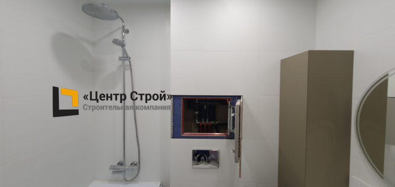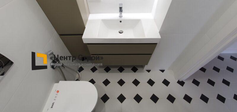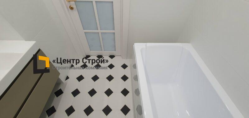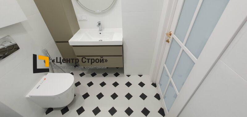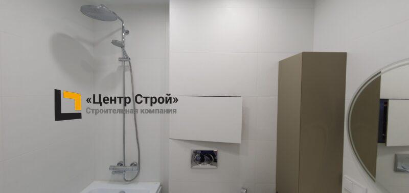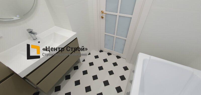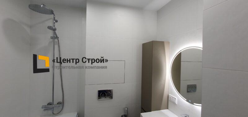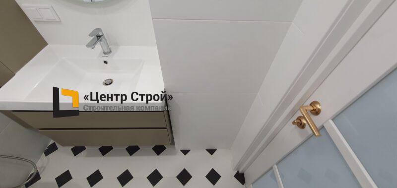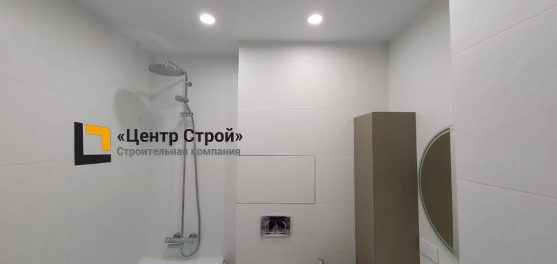 Стены — керамогранит 800 х 400 мм, пол — керамогранит 200 х 200 мм, натяжной потолок ПВХ — полотно BAUF, функциональное освещение — встраиваемые светильники.
