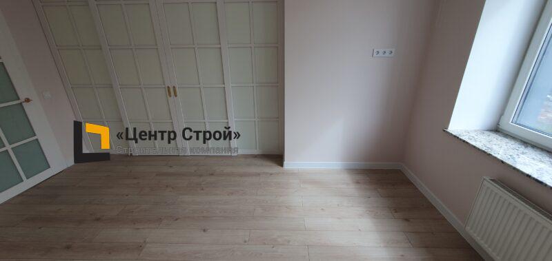 Стены — краска DULUX, пол — керамогранит 200 х 200 мм и ламинат с фаской, плинтус напольный МДФ под покраску белый, натяжной потолок ПВХ — полотно BAUF, функциональное освещение — встраиваемые светильники и люстра.